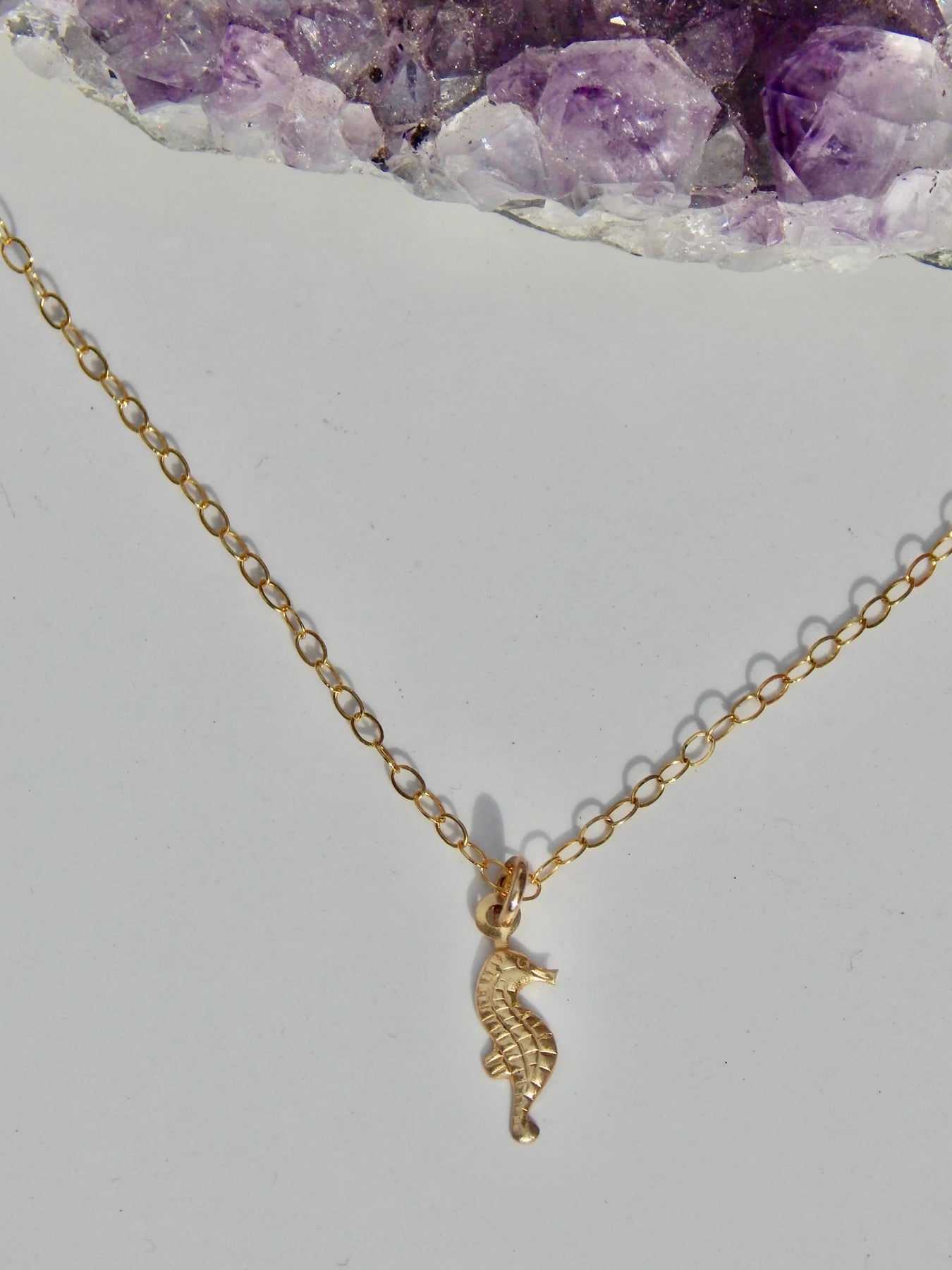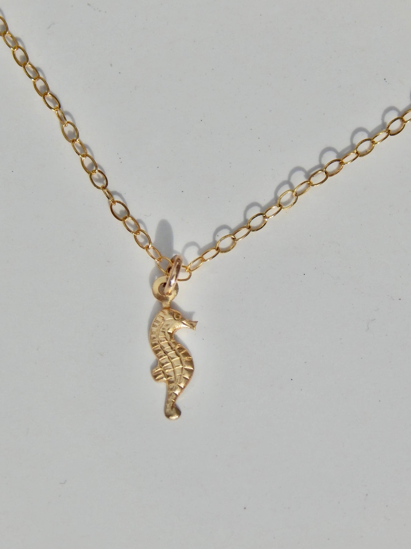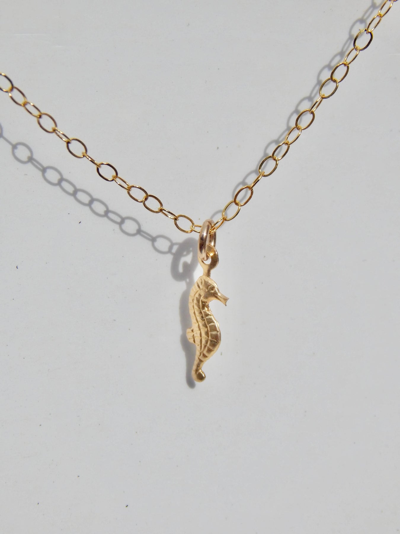 The Seahorse Necklace features a cute seahorse pendant dangling from a 14k gold fill chain.