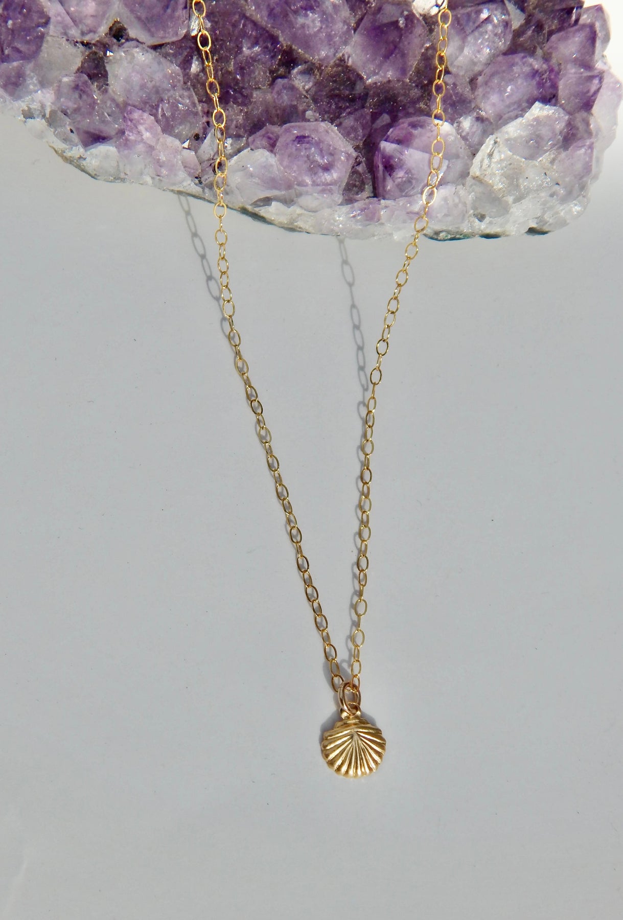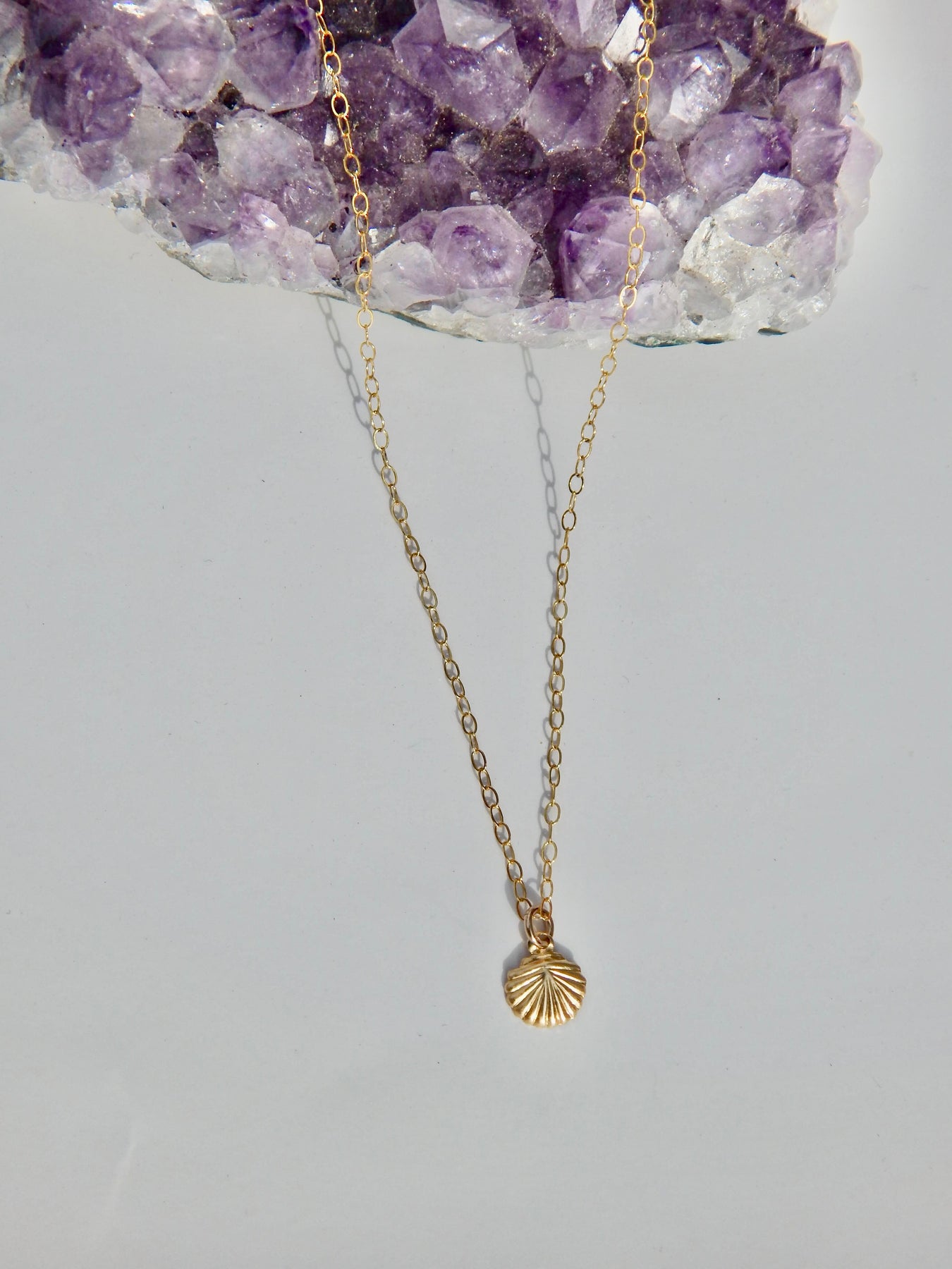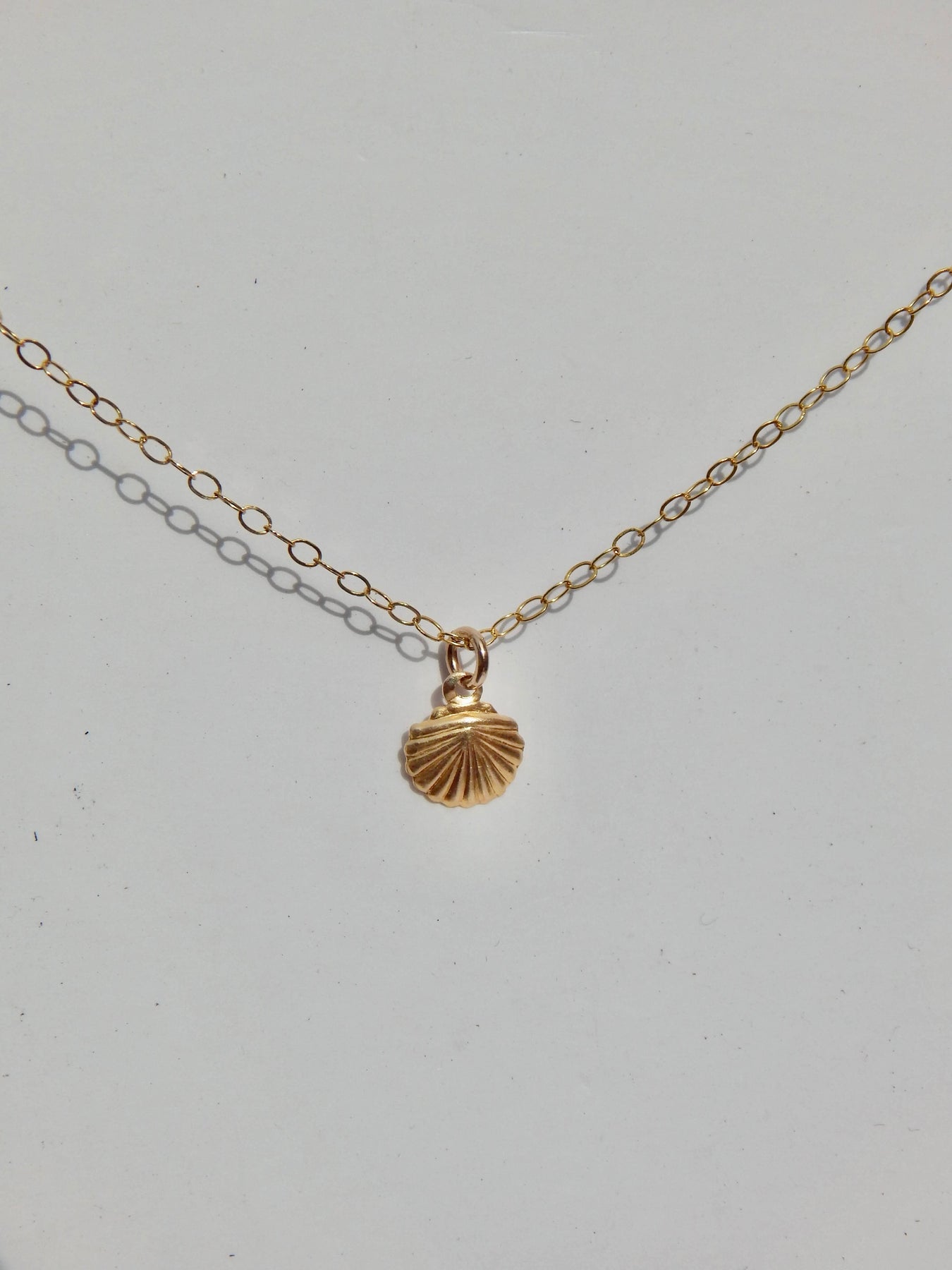 The Seashell Necklace features a cute seashell pendant dangling from a 14k gold fill chain.