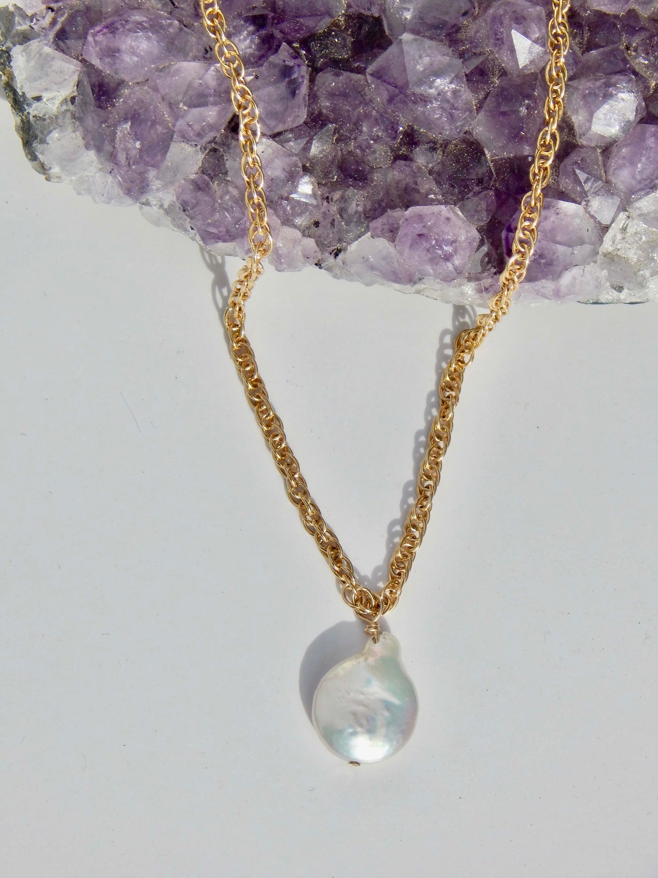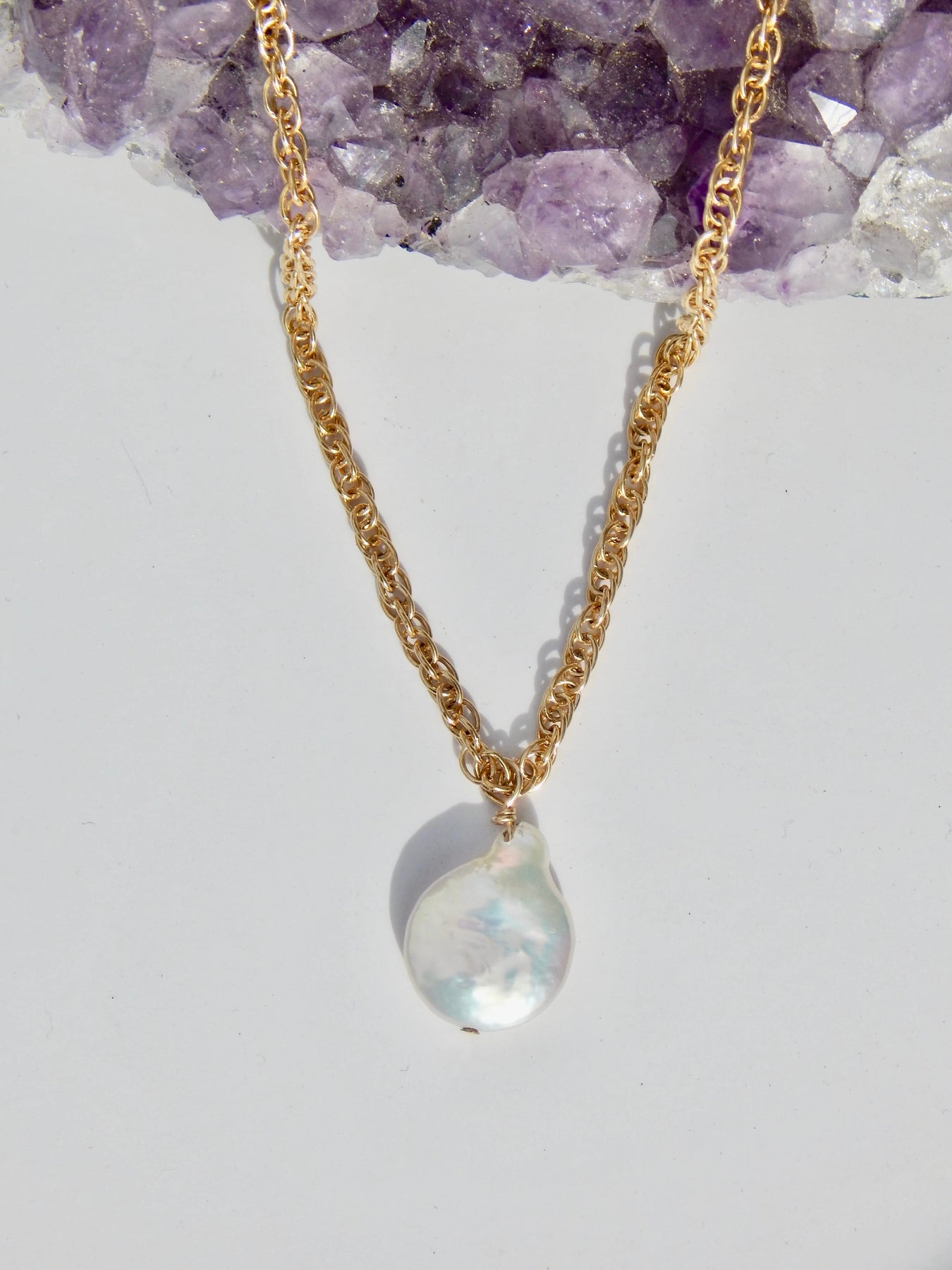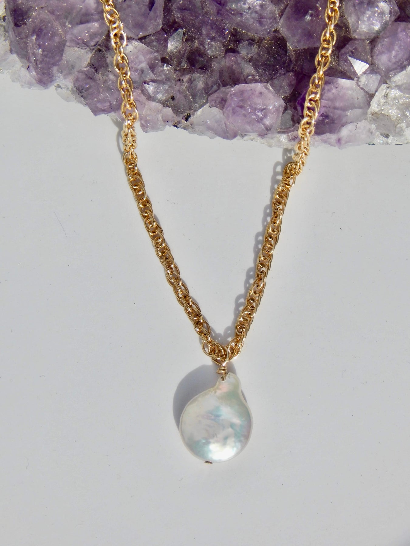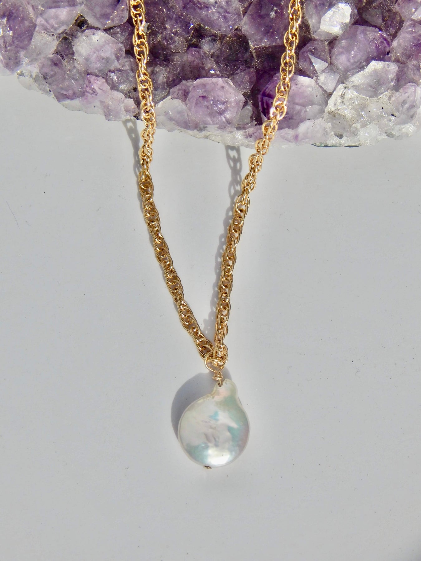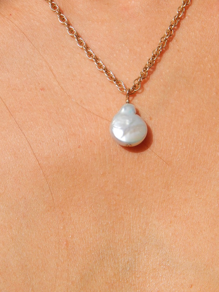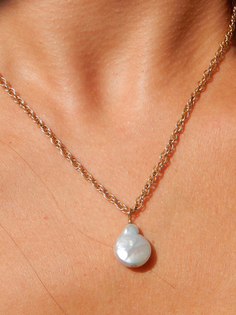 The Evangeline Necklace features a unique baroque pearl pendant dangling from an intricate 14k gold fill snake chain.