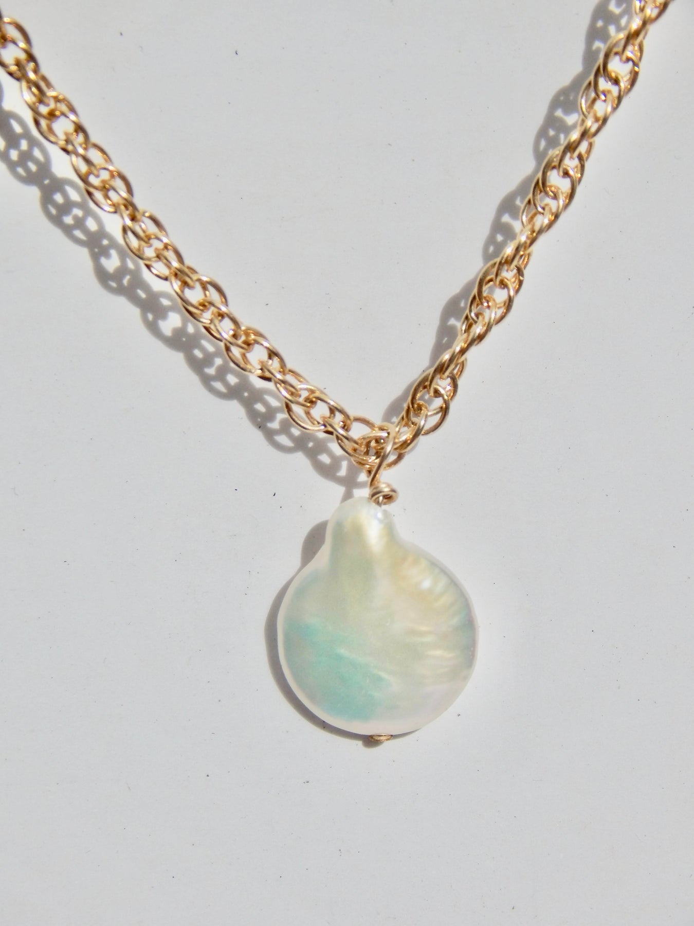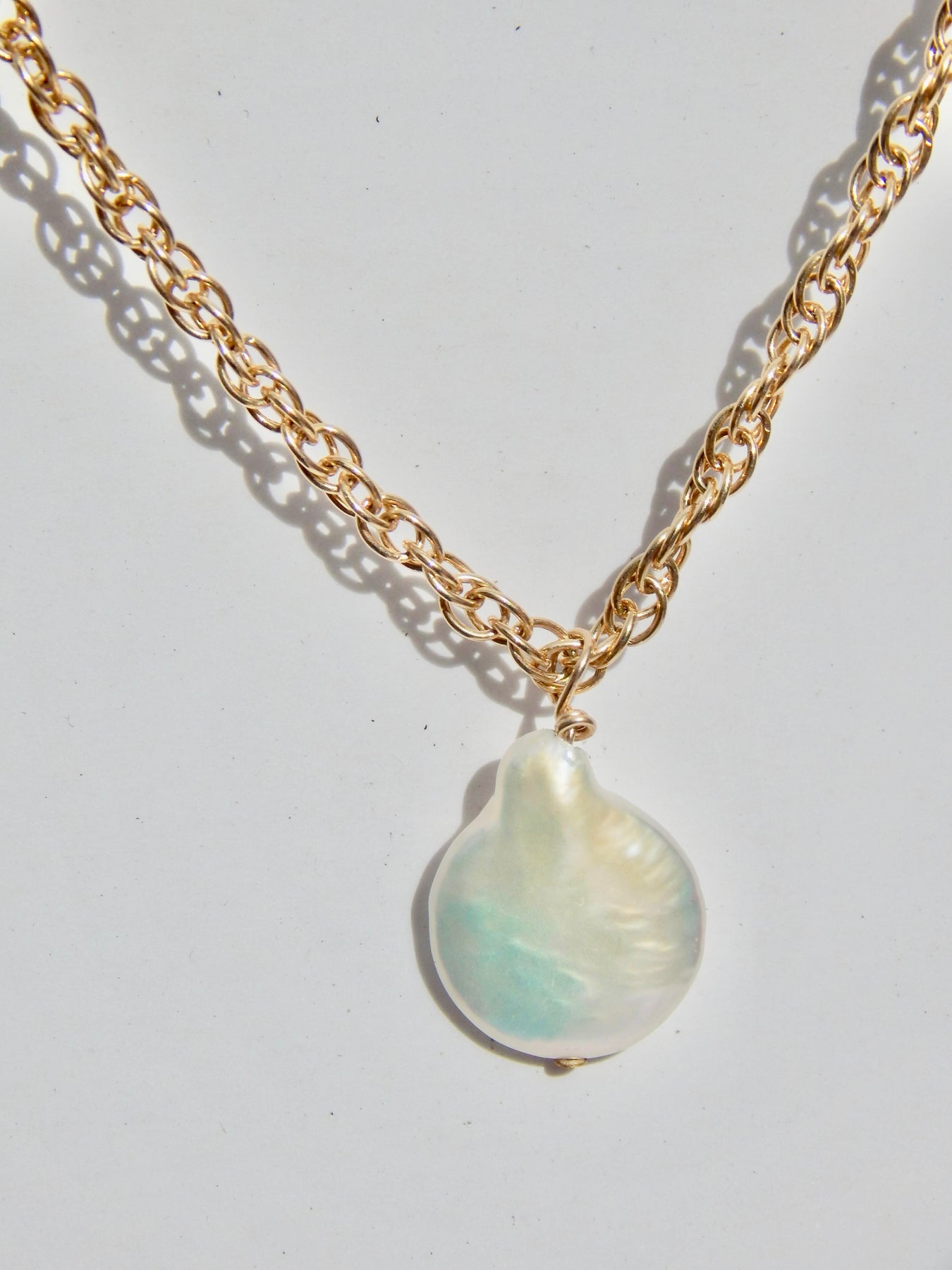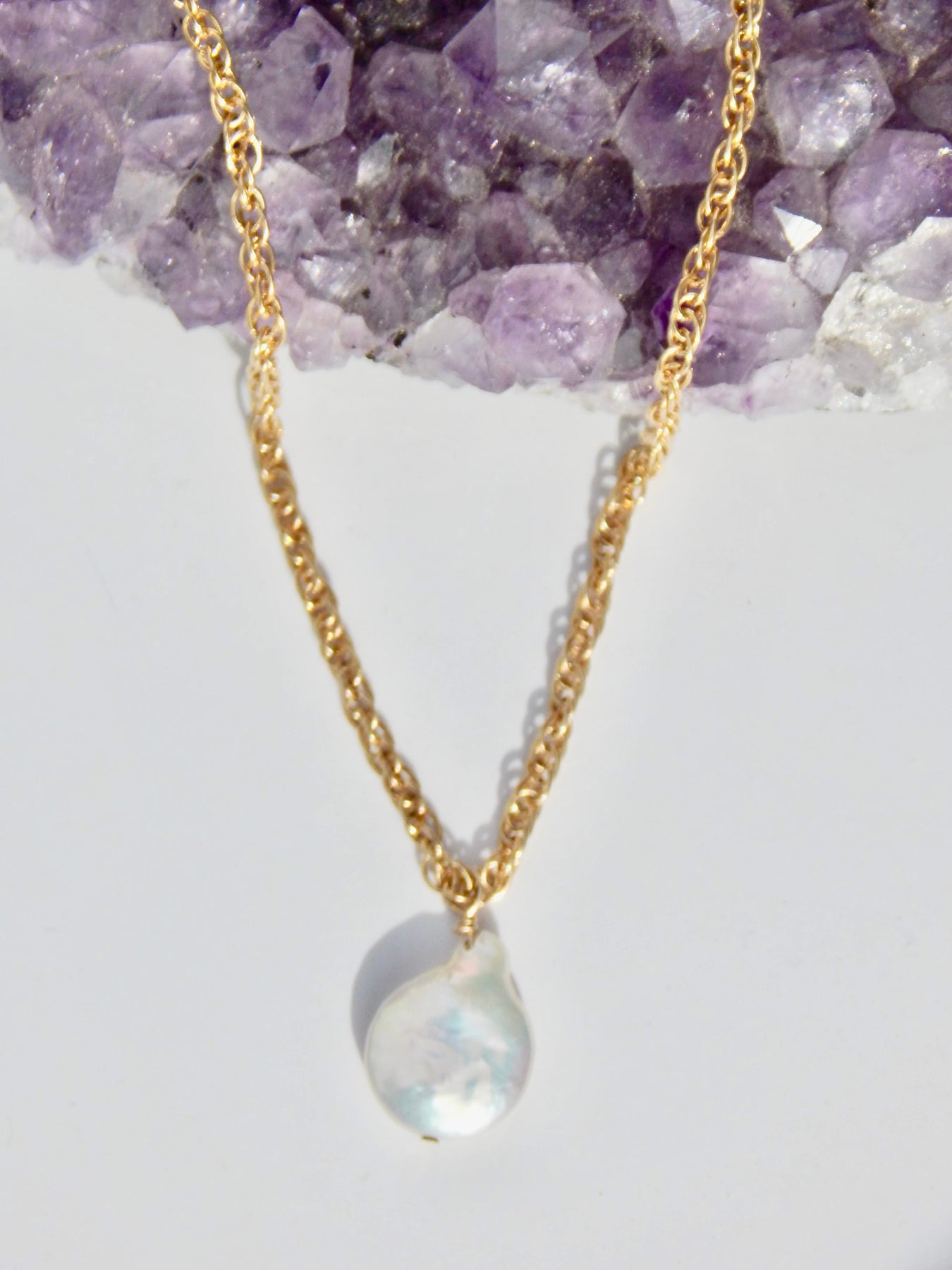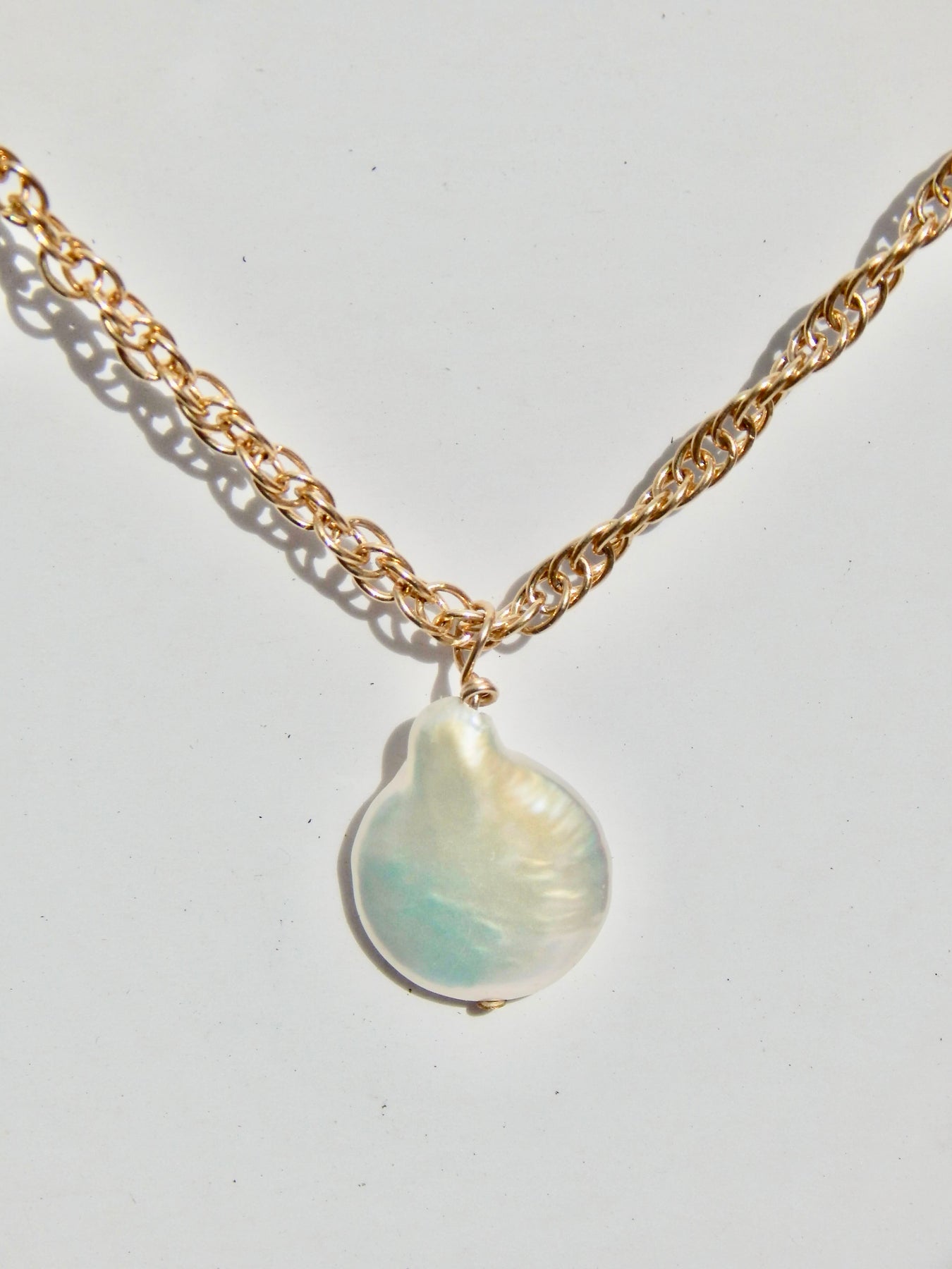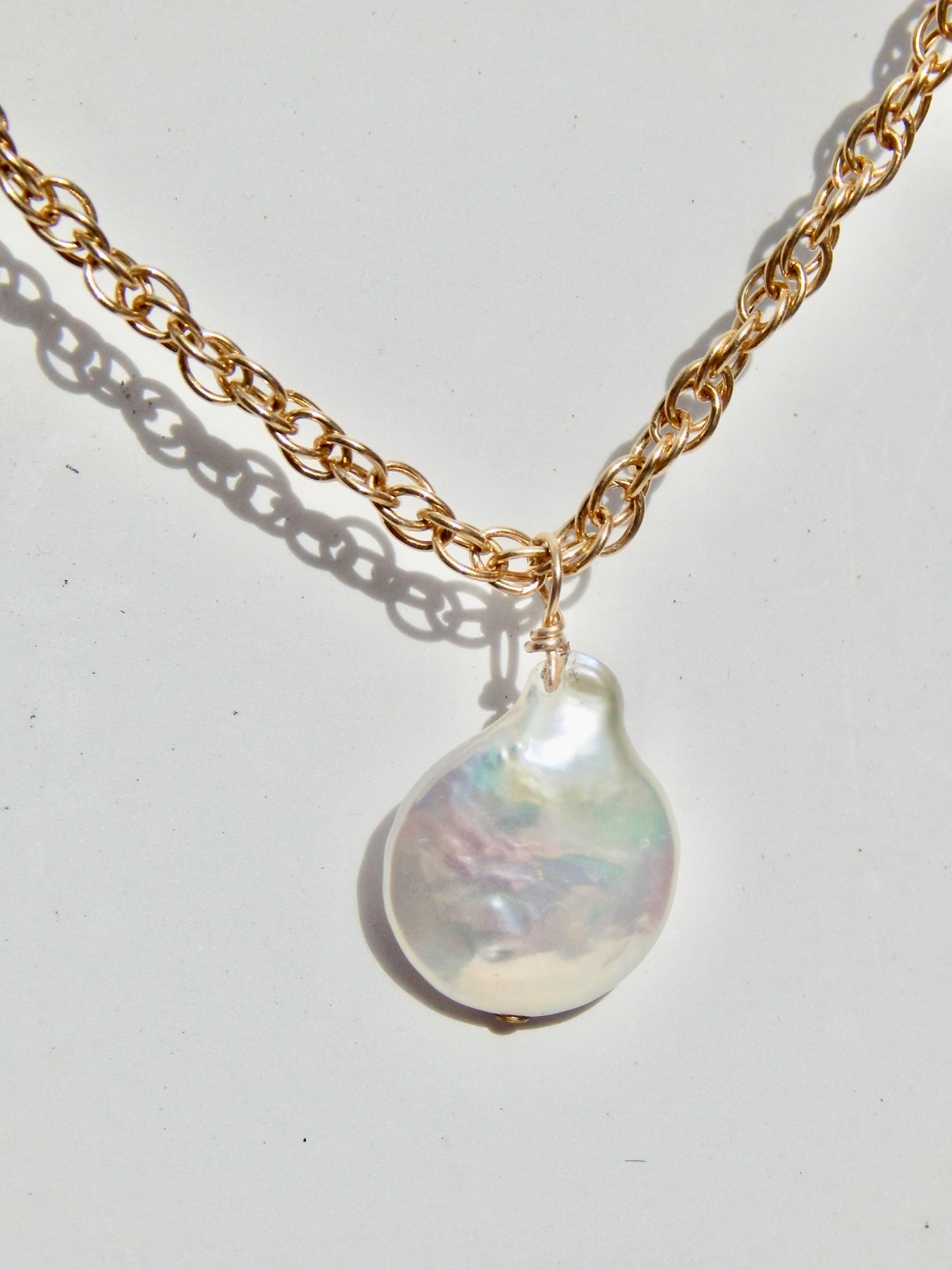 The Evangeline Necklace features a unique baroque pearl pendant dangling from an intricate 14k gold fill snake chain.